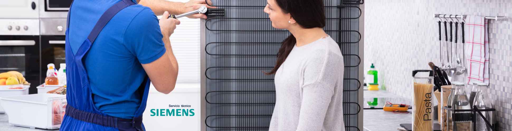 Realizamos todo tipo de intervenciones en sistemas de refrigeración Siemens: recargas de gas, cambios de termostato, sustitución de compresores, reparación de dispensadores de agua, etc. Contacte con nosotros en el 960 106 398 si su frigorífico, congelador o vinoteca no enfría, hace ruido, tiene alarmas encendidas, etc. Le enviaremos a uno de nuestros frigoristas especialistas Siemens a su hogar de inmediato para que le dé una solución a su problema.